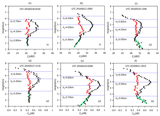 AVPDs of (a–c) ZH and (d–f) ZDR. Black dots indicate the original observations and red dots indicate the corrected values. Green lines represent the changing trends of the ZH and ZDR profiles under BB. The corresponding times and feature heights are marked in the figures. “GZ” means data are derived from the Guangzhou radar, and “YJ” means data are derived from the Yangjiang radar.