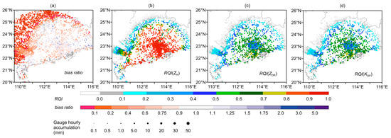 (a) Bias ratio distribution of the radar mosaic QPE within almost the entire range that can be detected by the two radars. The color bubbles in (a) are the same as those in Figure 13. (b–d) present the area distributions of the average RQI of ZH, ZDR, and KDP, as derived from nine rainfall events. The color bubbles in (b–d) indicate the average values of RQI at the gauge stations. Different colors indicate different RQI values. The bubble size indicates the average hourly rainfall accumulation at each gauge.