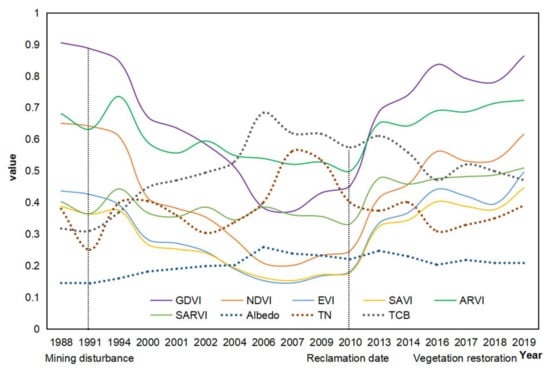The surface characteristics of REE mines at different stages such as mining disturbance, reclamation and vegetation restoration show great differences. The time trajectories of the biophysical indicators of a typical mine with restoration intervention were projected for the period 1988–2019. We noted that vegetation indices all showed a U-type curve in the mined areas, while other biophysical indicators such as albedo (α), TCB and LST demonstrated an inverse curvilinear character showing, more concretely, a mirror effect of the vegetation indices, i.e., a peak in the mined areas before restoration. An example is shown in Figure 2.