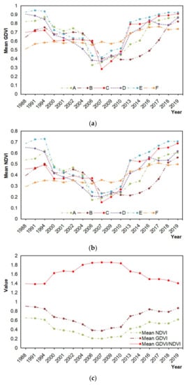 Time trajectories of the generalized difference vegetation index (GDVI) (a) and normalized difference vegetation index (NDVI) (b) of six typical mines. Time trajectory comparison of the mean GDVI and the mean NDVI (c), showing GDVI to have a wider dynamic range and higher sensitivity than NDVI in the mining areas (see Figure 5 for location of these mines and Table 6 for selection details).