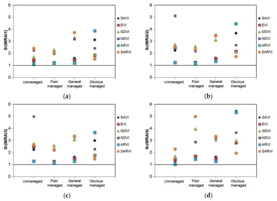 Sensitivity of mining and restoration assessment indicators (MRAIs) versus vegetation indices (VIs): (a) Sr(MRAI1); (b) Sr(MRAI2); (c) Sr(MRAI3); (d) Sr(MRAI4). Each sensitivity was the average of ten measurements in their corresponding mines at different stages (see Supplementary Materials).
