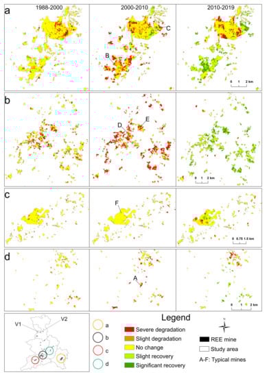 As previously mentioned, 1158 REE mines with a total surface area of about 66.29 km2 in the seven counties were identified by multitemporal satellite images though the mining period of these mines was different from one to another. The spatiotemporal changes in land degradation (e.g., vegetation loss and soil erosion) and restoration of mines are shown in Table 5 and Figure 5, taking the four most serious counties where REE mines are dominantly distributed (circles a, b, c and d) as an example.