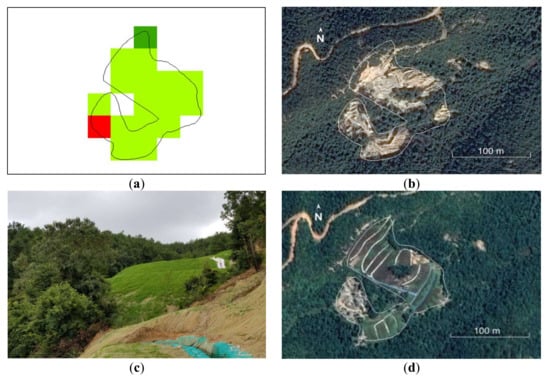 Restoration of REE mine close to Fengshan Village (V2: 115°0′35.97″E, 25°42′49.90″N). (a) Slight recovery detected by Landsat data because of the restoration engineering conducted in November 2018; (b) damaged landscape before management (29 February 2016, ©Google); (c) observed landscape in the field in July 2019; and (d) restoration seen on Google Earth (26 August 2019, ©Google).
