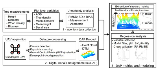 Remote sensing data associated with field inventory campaigns and modeling techniques have enabled increasingly reliable estimates of AGB [10,11,12]. Even where repeated inventory data are available, they have limited spatial coverage, which is insufficient for continuous spatial predictions of forest biomass [13]. This problem can be solved by associating the forest inventory with remote sensing data [14]. Three-dimensional products derived from light detection and ranging (LiDAR) have been used successfully in AGB estimation models in different types and forest formations [15,16,17,18]. However, despite the excellent accuracy of these models, the cost of this technique is still considered high, especially when the survey is carried out in large areas or when there is a need for different mappings in a short period of time, making it difficult or even impossible to use a LiDAR database. With the accelerated technological advancement of unmanned aerial vehicle (UAV) and image processing techniques, 3D products derived from digital aerial photogrammetry (DAP) have been showing satisfactory results in estimating AGB and other forest variables [19,20,21,22,23,24,25,26,27,28]. Several studies show that errors in forest attribute estimates with 3D products generated by DAP are comparable to those found using LiDAR data [29,30,31,32,33,34,35].