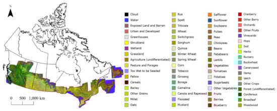 Generally, cropland classification has two main steps: (1) discriminating cropland from non-cropland areas, and (2) classifying various crop types within the cropland area. As discussed in Section 3, the AAFC’s ACI map along with the MODIS yearly land cover product were initially applied to distinguish croplands from non-croplands. However, the accuracies of these products, especially the MODIS product, in identifying the cropland areas are questionable at multiple regions. Thus, a considerable amount of error could have incurred at this step. It is therefore recommended to develop a specific algorithm to initially distinguish these two general categories (i.e., cropland and non-cropland) to produce a more accurate and reliable ACI map in the future.