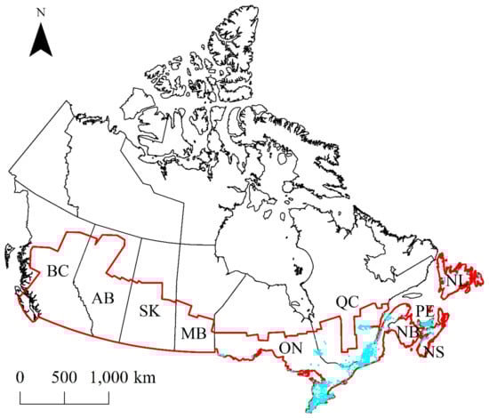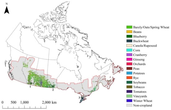 Figure 2 illustrates the study region in the red boundary with an area of 2.803 million km2 which comprises ~28% of Canada’s terrestrial landmass. This area includes important agricultural areas over 10 provinces of Canada, and it is the region with which AAFC generates its ACI maps. The study area contains a wide range of ecoregions and is characterized by various ecological factors, including climate, vegetation, and water because of its large extent and geography. Although land cover varies across the study area, it is mostly dominated by forests, wetlands, grassland, and croplands [3,15].