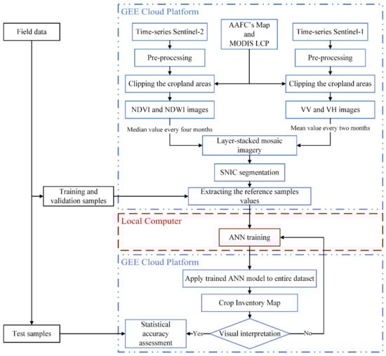 Flowchart of the proposed method to produce the Annual Space-Based Crop Inventory (ACI) map using Google Earth Engine (GEE) and Artificial Neural Network (ANN) algorithm (AAFC: Agriculture and Agri-Food Canada, NDVI: Normalized Difference Vegetation Index, NDWI: Normalized Difference Water Index, SNIC: Simple Non-Iterative Clustering, MODIS LCP: Moderate Resolution Imaging Spectroradiometer Land Cover Product).