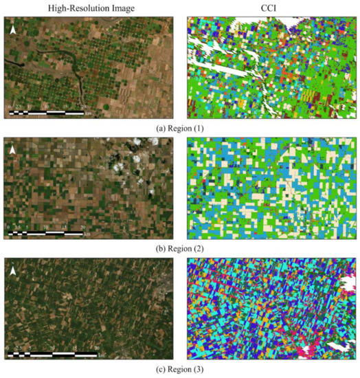 Figure 5 illustrates the object-based 2018 ACI map produced using the ANN algorithm and a combination of Sentinel-1 and -2 imagery within the GEE cloud computing platform. The resulting ACI map is visually clear and noise-free because of the incorporation of the SNIC algorithm for noise (salt-and-pepper) reduction, as mentioned in Section 3.3. Through the visual interpretation, it was observed that the proposed method was reasonably able to detect and classify the cropland classes. In this regard, three zoomed regions were explored and illustrated along with the corresponding high-resolution images available in ArcGIS to present the visual accuracy of the produced ACI map (see Figure 6).