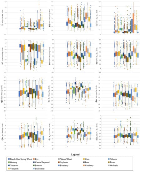 In this study, 17 classes were distinguished, some of which contained similar spectral and physical characteristics. Therefore, they had similar pixel values in both optical and SAR imagery. Figure 7 demonstrates the box plots of the 17 cropland classes using different spectral and SAR features at different time ranges in 2018. As is clear, there is a high overlap between the values of various croplands, which made the discrimination of these classes more challenging. This fact was also well reflected in the confusion matrix (Table 4) and the final ACI map (Figure 5) where a high confusion between some of the classes was observed and several misclassifications occurred. Furthermore, it was observed that using a specific feature at different time ranges was beneficial in discriminating various croplands. For example, the mosaic SAR images with the VH polarization (i.e., Figure 7g–i) had different patterns of box plots, indicating an improvement in cropland discrimination using the VH features generated at different seasons. It is finally worth noting that the confusion between multiple cropland classes would have been much worse if the numbers of the classes were not decreased to 17 classes.