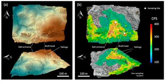 The DEM also indicates the exact location of the main (vertical) shaft and the entrance to the horizontal adit, with coinciding downslope aprons of radiologically distinct spoil material which was deposited as a by-product/waste of the primary copper extraction process (a photograph of which is shown in Figure S5, available as part of this manuscript’s accompanying Supplementary Information). The delineation of such radiogenic ore material via aerial system is, therefore, shown.