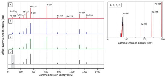 The processed (peak-isolated) spectrum derived from the summation of aerial measurements collected from region D in Figure 2, is shown also in Figure 4. Like the spectrum derived from regions A, B and C, the peaks present within this intensity normalised spectrum of a region approximately 100 m north from the highest levels radioactivity are the result of emissions from the same radioisotopes; 226Ra, 214Bi, 211Bi, 214Pb, 224Ra and 212Pb. While the activity of region D is 50% of that evidenced at positions A, B and C (190 CPS vs. 382 CPS), a combination of (i) lower-activity material outcropping or having been distributed at this location, and (ii) the detection of highly penetrating gamma-ray emissions from the elevated activity regions to the south, together contribute to the spectral signal, with the primary contributions from species within the 238U series decay chain, whereas the peak-isolated spectrum of D is largely identical to those of A, B and C—one difference that does exist is associated with the lower-energy region of the spectrum (highlighted), below 100 keV. This signal is ascribed to result from an increased background contribution and greater Compton (elastic) Scattering within the detector volume, a consequence of the more indirect and diffuse nature of the photons incident onto the detector, following increased prior interaction events.