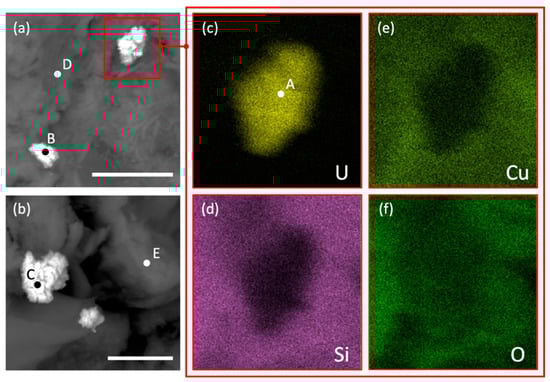 (a) and (b) Mixed Backscattered electron (BSE) and Secondary electron (SE2) images showing a typical U composition (high Z number) mineral grain (white) against the surrounding (low Z number) matrix (dark), EDS compositional maps of the mineral grain identified in (a), detailing the distribution of (c) U, (d) Si, (e) Cu, and (f) O. Scale bars = 5 µm. The locations at which EDS point analysis results (A–E) were also obtained and identified, as shown in Figure 7.