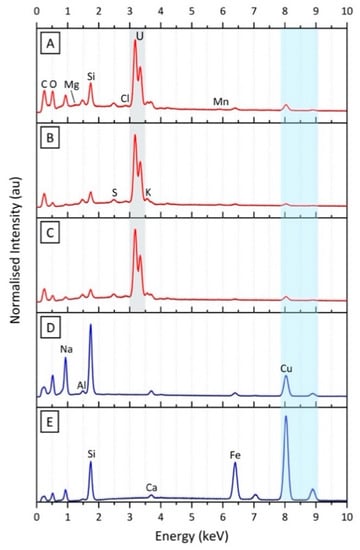 As is shown in the elemental maps of Figure 6d–f, in addition to the EDS spectra of points D and E (Figure 6a,b) shown in Figure 7, the bulk minerology surrounding the uranium minerals is composed of Si, Cu, Fe and O, alongside a number of other constituent light elements at lower concentrations. This non-uranium mineralogical assemblage likely represents one of the mine’s ore (or gangue) phases, known to occur at the site [17,18]—such as Chalcocite, Chalcopyrite, Chrysocolla, Malachite, Hematite or Quartz.