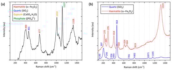 (a) and (b) Raman spectra of two regions within the crushed ore sample, illustrating the additional iron (haematite), quartz, gypsum and phosphate mineral phases that exist alongside the uranium and copper components identified via EDS, in Figure 7.
