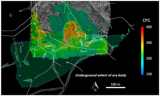 Following collection, data processing was performed to allow for the potential sub-surface ore body distribution to be assessed. To produce a map of gross activity at 1 m above the ground, the total count rate measured every 0.1 s by the detection platform was first converted into counts per second (CPS) before being height corrected (using altitude measurements obtained by the onboard laser rangefinder) by applying previously derived normalization factors associated with radiation emitted from planar (non-point) sources [22]. Following the export of the raw data from the Imitec Ltd. capture software, the display of the data was performed using either the contour plot function within OriginLab Pro or gnuplot (using Python), with smoothing and interpolation factors of 0.05 and 1.0, respectively, displaying the output within ArcGIS—a schematic of the workflow is shown in Figure S3a, contained in this manuscripts accompanying the Supplementary Information. The use of ArcGIS represents an entirely arbitrary step in the process (with the potential of being replaced with additional Python modules or the use of any open-source GIS program, e.g., QGIS or GRASS GIS), and can hence be easily substituted within the workflow presented.
