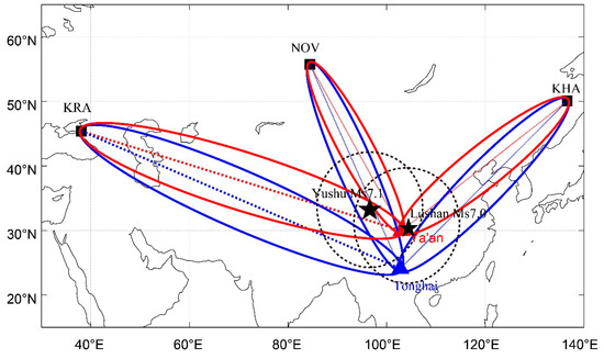 A sketch of the observation region. The three VLF transmitters in Russia denoted by black square, three receivers in China denoted by triangles (red for Ya’an, blue for Tonghai), the black pentagram represents the epicenter of the Yushu earthquake and the Lushan earthquake, the black dashed circle represents the preparation zone of the Yushu earthquake. The red and blue ellipse denotes the 5th fifth Fresnel region of frequency F1 (11.9 kHz).