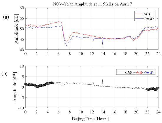 For the NF analysis, we took 7 hours nighttime VLF amplitude data during 21:00 LT–04:00 LT (22:00 Beijing Time–05:00 Beijing Time) for 20 days from 1 April 2010 to 20 April 2010. As explained and used by Maurya et al. [29] for the 2015 Nepal earthquakes, we estimated a total of three statistical parameters for the NF analysis. First, we also take the running mean of data for 3 days (window length 3 days) following Maurya et al. [22] and then calculated the difference dA(t) for a particular day as dA(t) = (A(t)-<A(t)>), where A(t) is the VLF amplitude at time t on that particular day and <A(t)> is the average value at the same time t for 3 days from 1 April to 20 April in 2010. An example of A(t), <A(t)> and dA(t) in the path between NOV and Ya’an is shown in Figure 2. The red solid line represents the A(t) of current day (7 April in Figure 2); the blue solid line represents the average value (<A(t)>) of the previous three days. The black line is dA(t), and the circles in Figure 2b are the selected data during 21:00 LT–04:00 LT (22:00 Beijing Time–05:00 Beijing Time). The three parameters for NF analysis are estimated using difference dA(t) and are defined as (1) trend (T): it is the average of nighttime amplitude difference dA(t) for each day; (2) dispersion (D): it is the standard deviation of nighttime amplitude difference dA(t) for each day; and (3) nighttime fluctuation (F): it is the (dA(t))2 over relevant night hours, which gives one data for each day. It should be noted that there are some data (e.g., the nighttime data between 1:00 and 2:00 Beijing time on 12 April, see supplementary Figure S1) descends to noise level, which is because the transmitter turns off in that time, these data have been excluded in our nighttime fluctuation analysis.