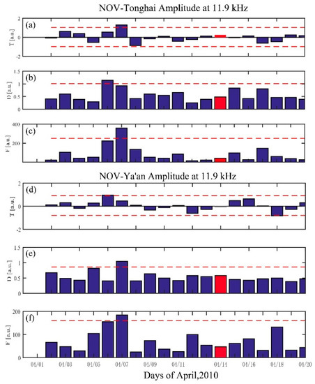 Because there are no recorded data from Tonghai station, we only consider the path between NOV and Ya’an. Fortunately, the Ya’an station is very close to the epicenter of the Lushan earthquake, so we were able to observe that the electromagnetic anomalies were remarkable on the night before the Lushan earthquake, as shown in Figure 6. The red rectangular box denotes the nighttime fluctuation and the red vertical bar represents the time of the Lushan earthquake. We also conduct the same NF analysis as the previous section. The nighttime fluctuation for the Lushan earthquake on 20 April 2013, is shown in Figure 7. Figure 7a–c show the trend (T), dispersion (D), and fluctuation (F), respectively. The parameters (T,D,F) exhibit an increase exceeding the 2σ criterion line on 19 and 20 April 2013, at the path between NOV and Ya’an, which correspond to the fluctuation on the night of 19 April and before dawn of 20 April. The anomalies detected in the Lushan earthquake is much more significant than that of the Yushu earthquake, which is probably because the receiver is very close to the epicenter of the Lushan earthquake.