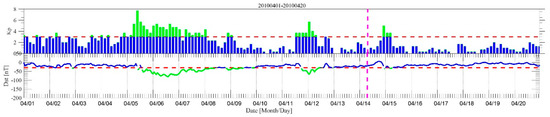 The Kp and Dst index during 1–20 April; the green histogram and curve indicate high geomagnetic activities and space weather activities and the pink dashed line denotes the original time of the Yushu earthquake.