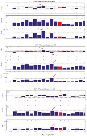 Nighttime fluctuation analysis of KHA-Ya’an at F1, F2, and F3 around the Yushu earthquake on 14 April 2010, shown in red. The trend (T) (a,d,g), dispersion (D) (b,e,h), and fluctuation (F) (c,f,i) of the three frequencies are shown separately. The horizontal line in each panel depicts the 2σ deviation criterion to define the anomalous day; the red arrows mark the anomaly.