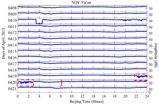 From Figure 1, we can see the epicenter of the Yushu earthquake located in the detecting region between the NOV transmitter and Ya’an and Tonghai. It is known that the detecting range is larger when the transmitting frequency is lower. Therefore, the signal with frequency F 1(11.9 kHz) is analyzed first; this is because we were trying to find anomaly that took place before the Yushu earthquake that occurred on 14 April 2010; data from 1 to 20 April 2010 are selected. For the Lushan earthquake that occurred on 20 April 2013, data from 5 to 21 April 2013 are selected. As mentioned above, only the amplitude of the electric field is analyzed, because the phase data is not good.