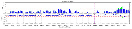 The Kp and Dst index during 5–25 April 2013; the green histogram and curve indicate high geomagnetic activities and space weather activities, and the pink dashed line denotes the actual time of the Lushan earthquake.