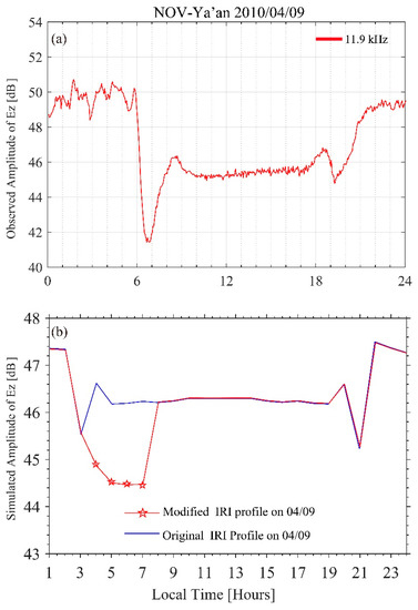 Firstly, we simulate the Ez (vertical component of electric field) amplitude for the 24 h of 9 April to compare with the observed data. The top panel of Figure 9 shows the continuous amplitude of Ez observed by CJA-1 on 9 April 2010. It shows that the electric field is stronger at nighttime. There are two obvious troughs of amplitude at about 7:00 and 20:00, which are denoted by terminator time corresponding to sunrise and sunset. The characteristic minima around the sunrise and sunset of local time is generated by the modal interference between the different modes [29]. The bottom panel shows the calculated Ez at 2700 km (comparable with the distance between NOV and Ya’an) away from the NOV transmitter on the same day. The calculated result also illustrates that the electric field is stronger at nighttime, and the difference is about 1 dB between nighttime and daytime, which is slightly smaller than the variation of the observed value between nighttime and daytime in the top panel (it should be noted the observation of the instrument is not the actual value of the electric field). The simulated terminator time is LT 3:00 and 21:00 under the original IRI profile, shown as a blue solid line in the bottom panel of Figure 9, which is because the daytime electron density referenced from IRI is from 4:00 to 20:00 LT (the bottom height of the ionosphere is 65 km). If we change the bottom height of the ionosphere to 80 km from LT 4:00 to 7:00 of IRI profile, it is equal to shifting the sunrise time to LT 7:00. We can see a simulated terminator time shift to LT 7:00 (red solid line with pentagrams in the bottom panel of Figure 9), which indicates that the bottom boundary of the ionosphere may control the terminator time shift. Details of the terminator time shift will be discussed in Section 5.2.