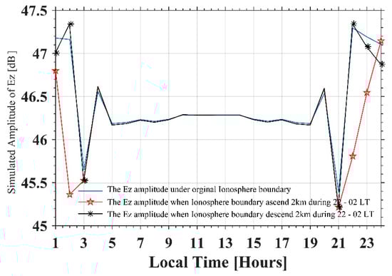 As is known, the amplitude of an electric field at different ground locations will be different, owing to modal interference in the waveguide. Figure 14a,b shows the simulated Ez of the electric field 2400 km and 3000 km away from the NOV transmitter. The intensity of Ez is different at different locations. The terminator time is slightly different because of different modal interferences, but the main characteristics of sunrise and sunset have been shown in the figure. The electric field at these locations could also be disturbed by variation in bottom boundary of the ionosphere at the different locations (the red solid line with pentagrams shown in Figure 14a,b). The red solid line with pentagrams in Figure 14a shows the Ez components increased when the bottom height of the ionosphere descends to 63 km at LT 11:00. The simulated increasing amplitude of the electric field could be possible in a longer propagating path with descending reflection height, which was illustrated by Mcrae and Thomson [51] using observed data from the NLK transmitter to the VLF receiver located at Dunedin. The red solid line with pentagrams in Figure 14b shows the Ez components decrease 3000 km from NOV when the bottom height of the ionosphere descends to 63 km at LT 11:00, compared to the original IRI profile.