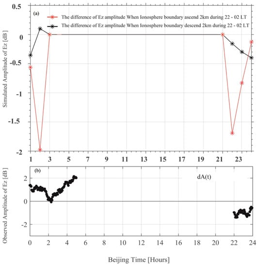 Furthermore, we calculate the difference in Ez amplitude between the changed bottom height of the ionosphere and the original ionosphere profile (Figure 11). The black solid line with asterisks is the difference in Ez amplitude when the bottom height of the ionosphere is set to 78 km and the original is 80 km. The difference of Ez is less than 0 in 22:00–24:00 (represents less than the original background value) and then increases in 0:00–2:00 LT and become greater than 0 from 1:00–2:00 LT, when the bottom height of the ionosphere descends 2 km. Because the original nighttime IRI profile is during 21:00–3:00 LT (7 h), we only simulate the electric field during 22:00–2:00 LT (5 h); the electric field after 02:00 is not simulated. We see that the difference is less than 0 in the early night and becomes greater than 0 before dawn. This changing trend is similar to the observation in Figure 11b, which the dA(t) (difference between observed value of current day and value of background) is less than 0 in the early night and becomes greater than 0 before dawn. The red solid line with asterisks is the difference in Ez amplitude when the bottom height of ionosphere is set to 82 km and the original is 80 km. The difference is always less than 0 under this setting. Thus, a more plausible explanation in this event is that the anomaly is induced by an increase in D region electron density caused by seismogenic activity, which lowers the bottom height of the lower ionosphere; however, this needs to be confirmed by more observations in future study.