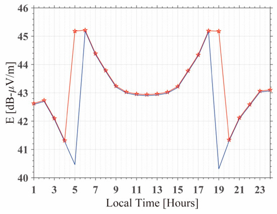 The calculated Ez component of the electric field 1,350 km away from the NWC transmitter with 19.8 kHz. The blue solid line shows the simulated result when the sunrise time was set at LT 5:00 and sunset was at LT 19:00. The red solid line with pentagrams shows the simulated result when the sunrise time was set at LT 4:00 and the sunset time was at LT 20:00.