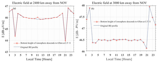 The figure shows the calculated Ez component of the electric field 2400 km (a) and 3000 km (b) from the NOV transmitter at 11.9 kHz. In (a), the blue solid line shows the simulated result under the original IRI profile; the red solid line with pentagrams shows the simulated result when the bottom height of the ionosphere descends at LT 11:00 2400 km from the NOV transmitter. In (b), the blue solid line shows the simulated result under the original IRI profile; the red solid line with pentagrams shows the simulated result when the bottom height of the ionosphere ascends at LT 11:00 3000 km from the NOV transmitter.