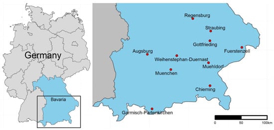 Disdrometer locations in Bavaria (SE Germany) that were used to measure rain microstructure, covering a total of 18,600 h of rain in a period of 36 months.