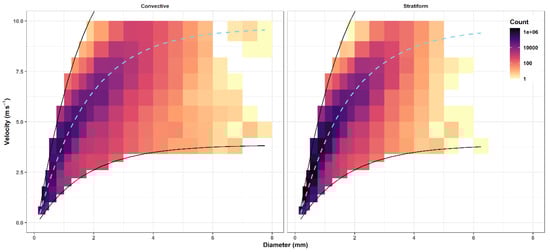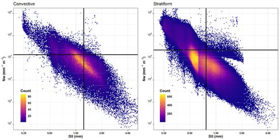 Stratiform rain had smaller drops and lower drop concentrations compared to convective rain (Figure 5). The average D0 for stratiform rain was 0.77 mm compared to 1.24 mm in convective rain. Normalized drop concentration Nw in stratiform rain was around 2.24 × 104 mm−1 m−3, while convective rain had an average of 1.4 × 104 mm−1 m−3. The overall average of D0 (0.81 mm) and Nw (2.17 × 104 mm−1 m−3) were closer to the values of stratiform rain since most rain intervals were of the stratiform type. The clusters in the values of D0 that appear in Figure 5 emerge from the combined effect of the diameter range bins of the disdrometer measurements, and the logarithmic scales on the horizontal axis.