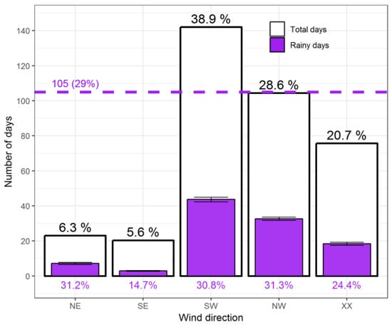 Frequency of rainy days per year and per wind direction classes that represent large-scale weather types. Rainy days are days on which at least one station recorded five minutes of rain with an intensity of more than 0.2 mm/h. Error bars represent the 95% confidence intervals. Percentages above the white columns represent the overall occurrence of each wind direction and percentages below the columns represent the portion of rainy days in the total number of days within a specific wind direction. The dashed line represents the mean number of rainy days per year.