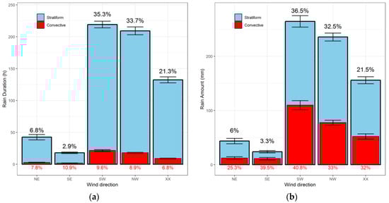 Prevalence of convective and stratiform rain types. Accumulated rain duration (a), and rain amount (b) per wind direction averaged over the stations and years. Error bars represent the 95% confidence intervals. The percentages on top of each column represent the proportion of accumulated rain within the respective wind direction to the accumulated rain in the whole year. The percentages below the columns represent the proportion of convective rain to total rain within the respective wind direction.