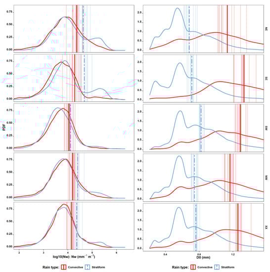 Probability density plots of log10(NW) and D0 for each rain type and wind direction. Vertical thick lines show parameters averaged over all locations for convective (solid red line) and stratiform (dashed thick blue) rain and light lines represent averages for individual locations.
