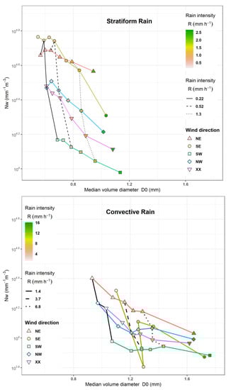 For convective rain, only few differences in the previously described patterns were obvious especially when examining the rain microstructure for different ranges of rain intensities. With the exception of SE which had a limited number of convective intervals compared to the remaining wind directions, the median diameter D0 was still the largest in SW and the smallest in NE, while NW was the largest NE and the smallest in Sw. XX and NW had similar NW values but NW exhibited larger drop sizes on average. The wind direction SE did not show any consistent pattern across rain intensity ranges.