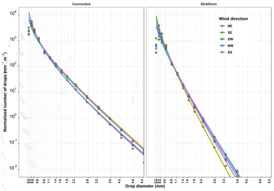 Raindrop concentration per millimeter diameter and cubic meter for each wind direction in stratiform rain and convective rain. Points represent the one-minute average concentrations for each diameter range colored by wind direction. Colored lines represent the corresponding gamma distribution fits.