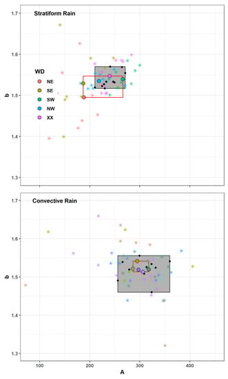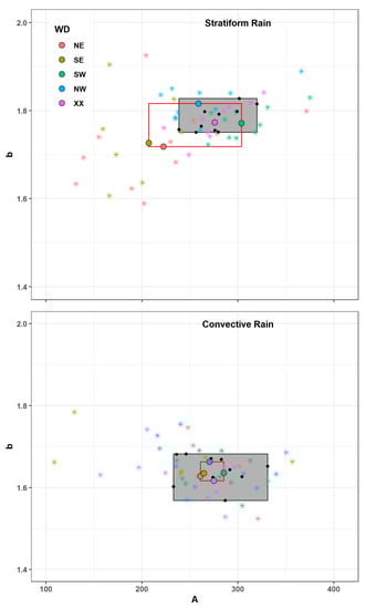 The average value of the prefactor A was clearly larger in convective rain (309) than in stratiform rain (239), while the exponent b value was similar for both rain types (1.53). The values of A and b were averaged for each location (black points in Figure 9; Figure 10), for each wind direction (colored points in Figure 9; Figure 10), and for each combination of location and wind direction (colored stars in Figure 9; Figure 10) in order to demonstrate the variability of A and b with these factors.