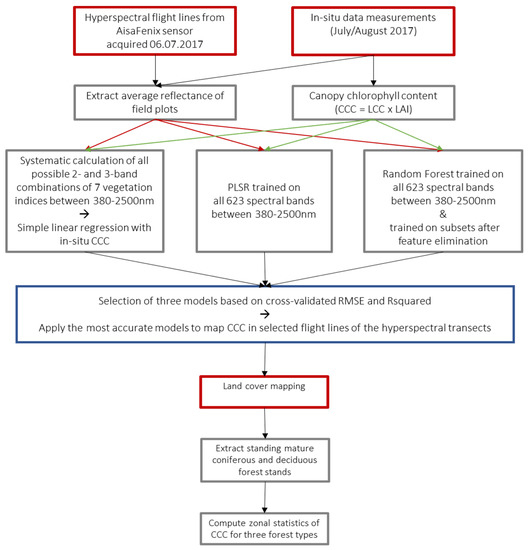 The methodological framework is outlined in Figure 2. The average spectrum of all pixels within a radius of 4 pixels around the centroid of the field plots (27 × 27 m to avoid edge effects) was extracted from each corresponding flight line. Where a field plot was covered by multiple flight lines, the reflectance was extracted from all cloudless lines and averaged for each plot. Ten of the 40 plots were not included in the analysis as they were outside the image extent, covered by clouds in all flight lines or affected by georeferencing errors. The statistical software R was used for the computation of all models and model validation [47].