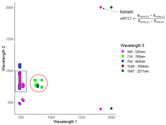 Additionally, all possible three-band combinations of 623 bands between 380 nm and 2500 nm (623 × 622 × 621 = 240,641,226 wavelength combinations) were calculated for narrowband MERIS terrestrial chlorophyll index (nMTCI) according to formula (7):