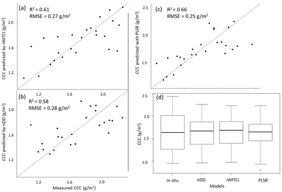 Scatterplot of the in situ CCC and predicted values made by (a) nMTCI with optimal wavelength combinations, (b) nDD with optimal wavelength combinations, and (c) Partial least squares regression (PLSR) with five components. The dotted line shows the 1:1 relationship between predicted and measured values. (d) Boxplot of in situ and predicted CCC (g/m2) using the three selected models. Mean CCC was 1.64 g/m2 for all models as well as in situ CCC. The median predicted CCC was 1.67 g/m2, 1.69 g/m2 and 1.65 g/m2 for nDD, nMTCI and PLSR, respectively. The median in situ CCC was 1.64 g/m2.