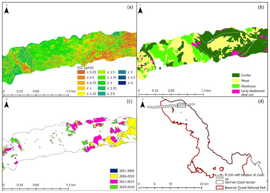 Close up of eastern site of light line 193; (a) Canopy chlorophyll content map derived with PLSR, (b) Land cover classification map, (c) Deadwood classification map, (d) Location plan of flight line 193 and the close-up in relation to the Bavarian Forest National Park. Forest classification map from land cover map. Deadwood classification map from infestation map (obtained from aerial photographs) available from the national park administration [85].