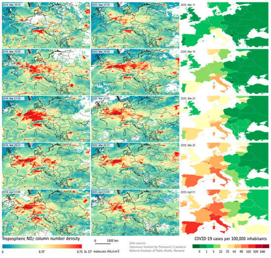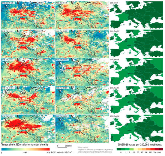 The analyses of the maps and data from mid-January to the second 10-day period of February (Figure 1) reveal the fact that no considerable changes occurred between 2019 and 2020 with respect to the level of the NO2 pollution, as it maintains high values on large areas across Europe. This period corresponds to the normal condition of economic activities and the beginning of the COVID-19 epidemic in Europe, characterized by the occurrence of isolated cases in different countries. The differences can also be explained by the high dynamics of the NO2 gases in the atmosphere, as the wind can disperse the NO2 pollutants in less than 30 min [128].