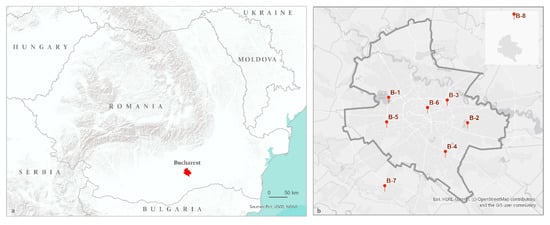 Location map of Bucharest (a) and the distribution of the air quality ground-based stations (b).