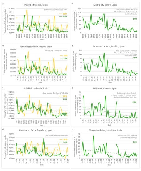 Comparative dynamics of NO2 daily values for the period between 15 January and 30 April for several Spanish cities, based on clear-sky TROPOMI (TROPOsferic Monitoring Instrument) data in 2019 and 2020 (a–d) and ground-based measurements in 2020 (e–h).