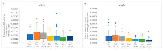 According to the Climate Copernicus Service [134], the 2019–2020 winter recorded higher surface temperatures compared to previous periods. In this regard, the surface temperature anomaly, with respect to the 1981–2010 average, was 3.24 °C in January 2020 and 3.85 °C in February 2020, while for the same months of the 2019 year, the anomalies were lower, namely 0.85 and 2.97 °C, respectively. For the March–April period, the surface temperature anomalies differences are lower, as follows: 2.52 and 1.50 °C for March and April 2020, respectively, compared to 2.34 and 1.56 °C for March and April 2019, respectively. However, the remarkable decrease of the NO2 pollution level in spring 2020, compared to the same period of the 2019 year, corresponds to the March–April COVID-19 outbreak. The outlier points on Figure 8 represents high values of the tropospheric NO2 column number density, which are very different from the standard deviation values of the time interval, corresponding to the most polluted days for the analyzed period.