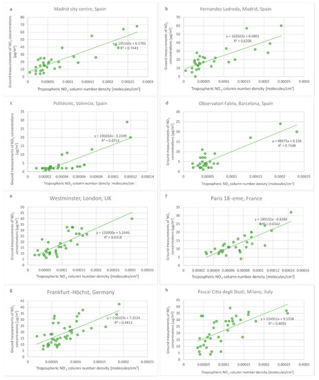 Data correlation between satellite-based tropospheric NO2 column number density derived from TROPOMI (S-5P) L3 products and ground-based measurements of NO2 concentrations for various European cities as follows: Madrid City Center (a); Fernandez Ladreda Station, Madrid (b); Valencia, Spain (c); Barcelona, Spain (d); London, UK (e); Paris, France (f); Frankfurt, Germany (g); Milano, Italy (h).