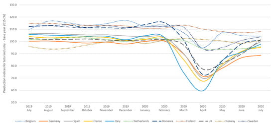 Industrial Production Index (base year 2015) for the July 2019–July 2020 period (data source: Eurostat, 2020).