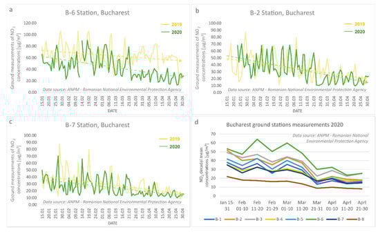 NO2 concentrations dynamics between 15 January and 30 April in 2019 and 2020 measured at different ground stations in Bucharest, classified as urban traffic (a), urban background (b), and suburban (c). NO2 10-day mean concentration dynamics from 15 January to 30 April 2020 at all air quality monitoring ground-based stations in Bucharest (d).